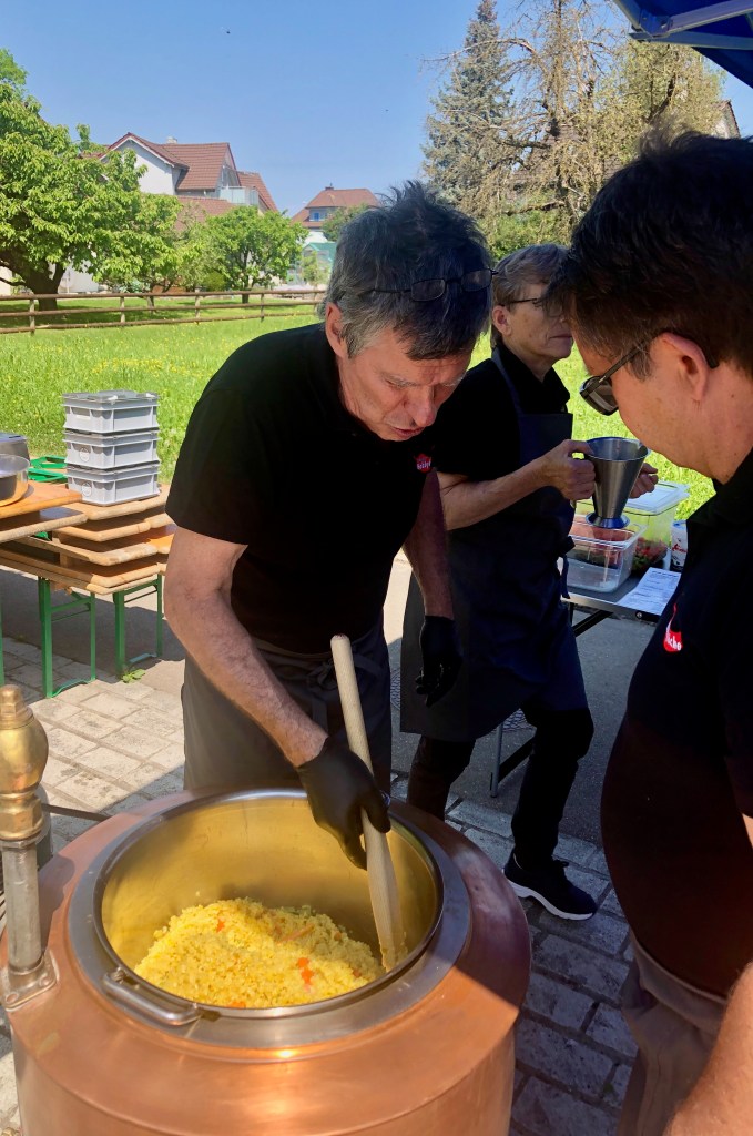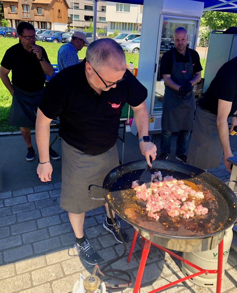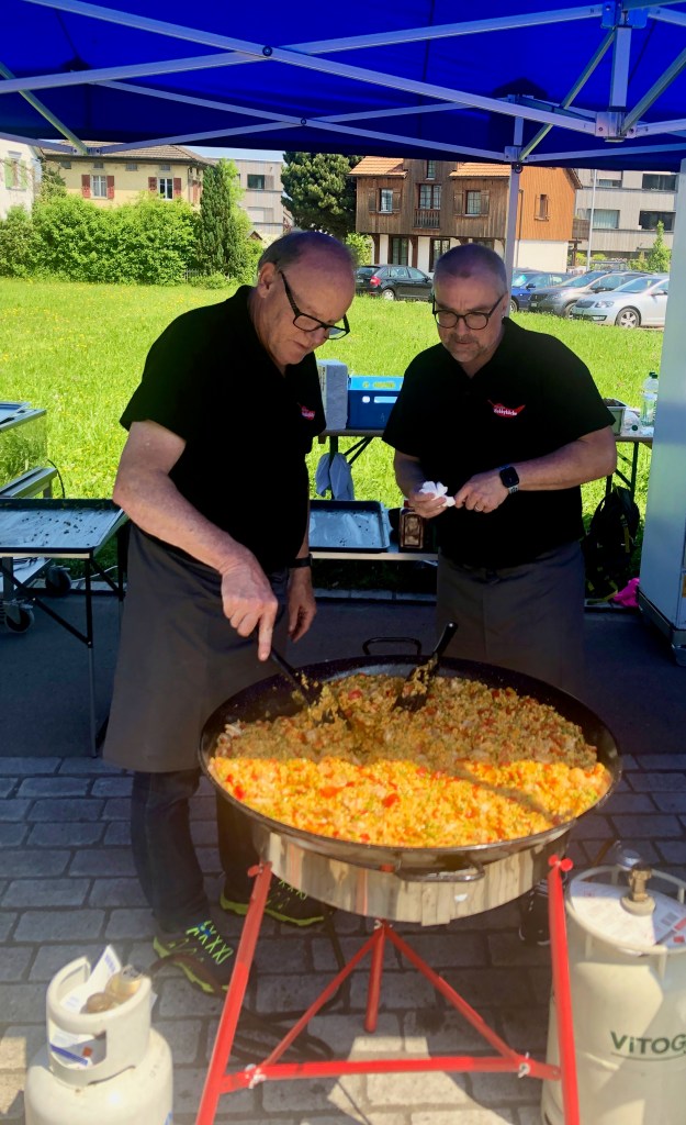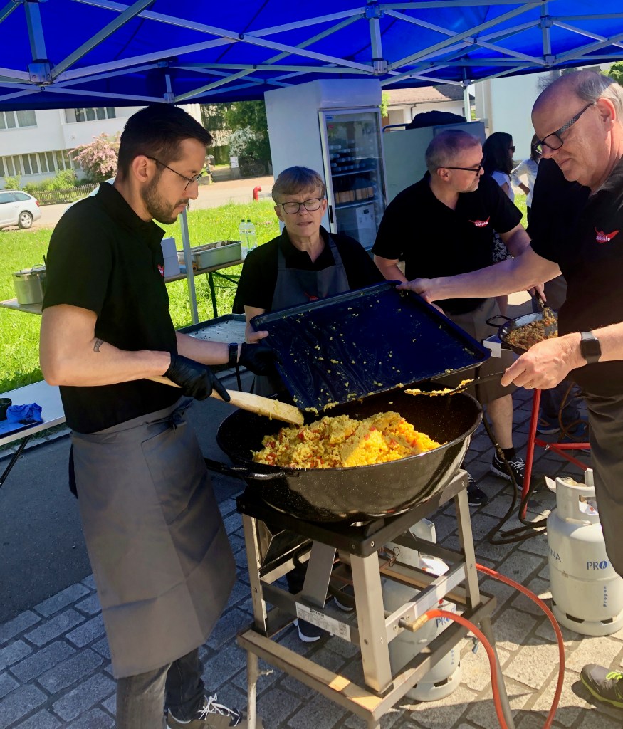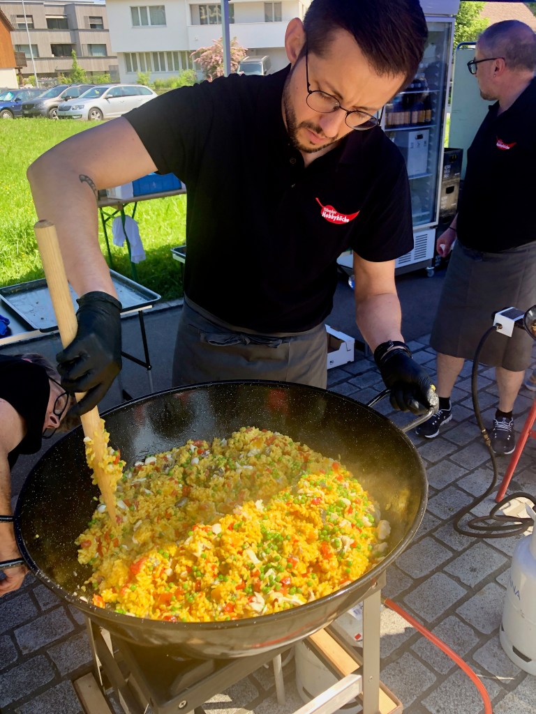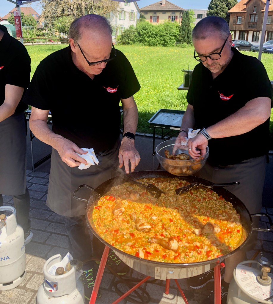Das Mittagsangebot bestand aus dreierlei Paella-Varianten: mit Poulet, mit Fisch oder vegetarisch konnte das spanische Reisgericht genossen werden. Da das Wetter bei diesem Anlass vollumfänglich mitspielte, lud der Hermetplatz die Gäste noch zum Verweilen ein…